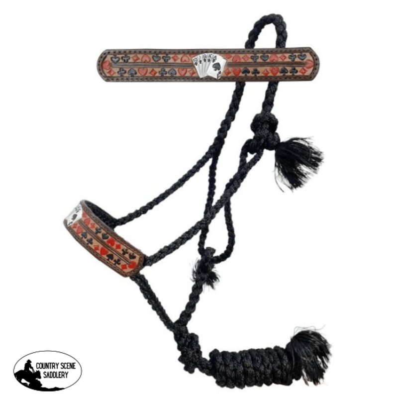 16912ShowmanWoven Black Nylon Mule Tape Halter -'Royal Flush'This mule tape halter is the perfect accessory for your equine friend. This halter features a wide two-toned brown leather nose band with a hand painted 'Royal Flush' design in the center. The li
