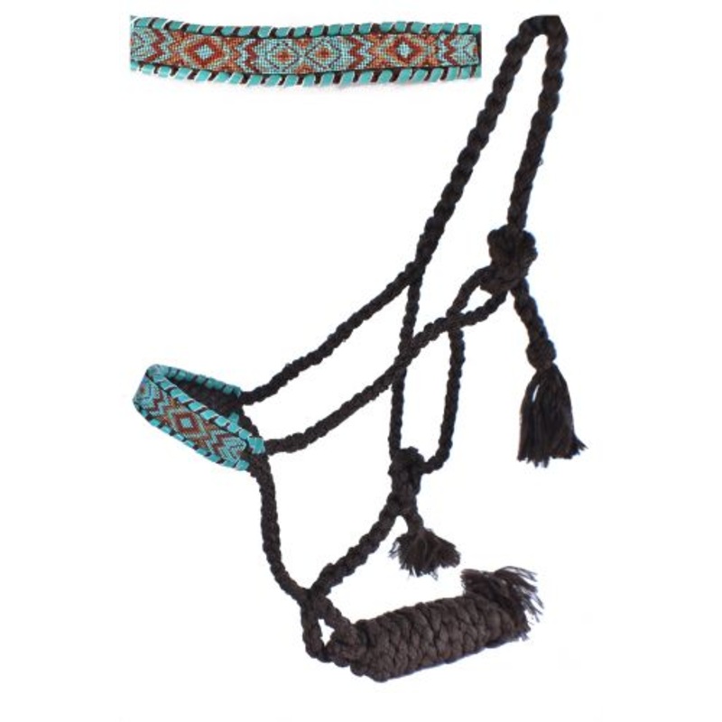 ShowmanWoven brown nylon mule tape halter with teal and gold beaded design.This mule tape style halter features woven nylon with a removable 8' lead. Features a wide leather noseband with teal and gold beaded aztec design and trimmed in teal leather lacing