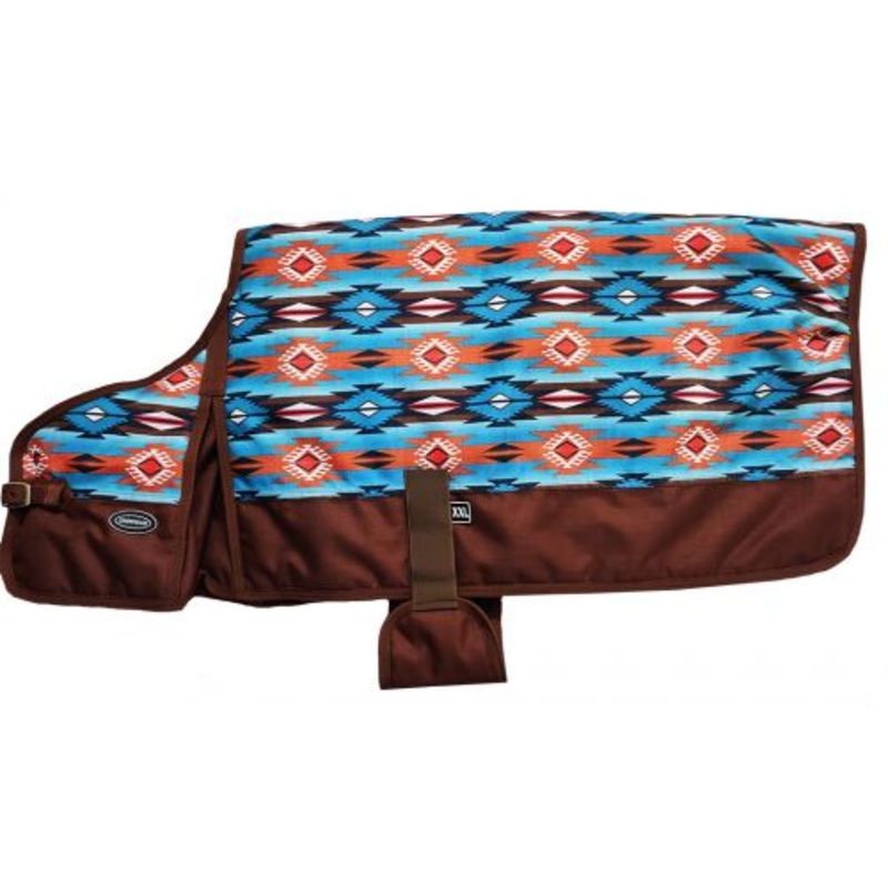 Showman XXLarge Teal and Orange Southwest Design Waterproof Dog blanket. This blanket is constructed of 1200 denier rip stop waterproof poly, a 70 denier breathable lining and 200 gram poly fill insulation. Features an adjustable belly wrap with quick grip closures, shoulder gussets to allow freedom of movement, a buckle front and a cut out for the tail.Measure your dog from the middle of the chest, around the side to the center of the tail.SIZE CHARTXSmall (17-19)Small (20-22)Medium (23-27)Large (28-31)XLarge (32-35)XXLarge (36-39)var TabbedPanels1=new Spry.Widget.TabbedPanels(TabbedPanels1);