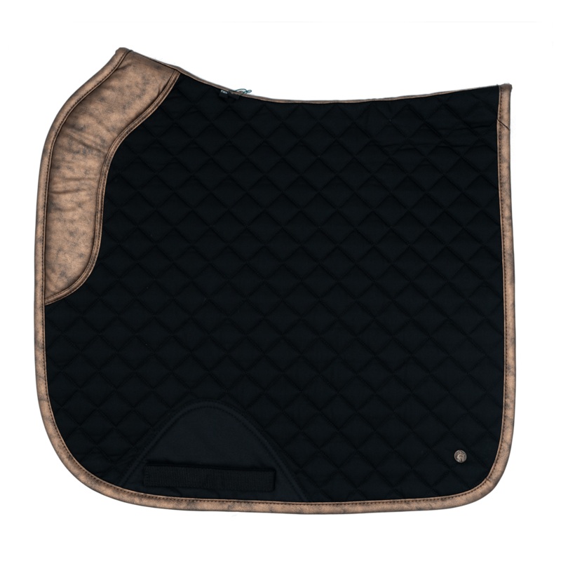 16C Dressage Saddle Pad Black with Gold Leaf TrimFinished in our signature vegan leatherette bindingSleek and refined, this dressage pad features enhanced wither padding for gentle support and a secure saddle fitideal for custom saddles that dont require a