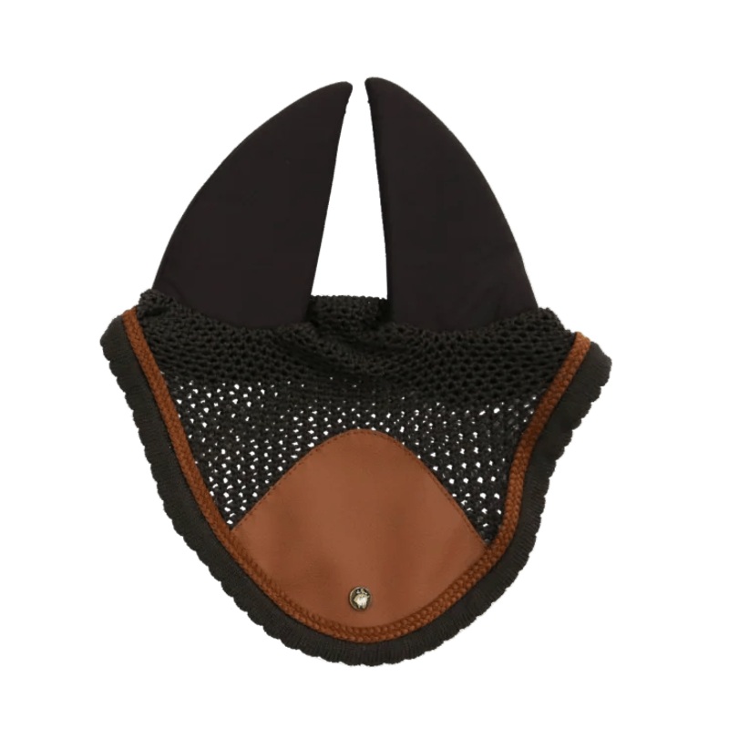 In stock & ready to ship! 16C Ear Net in tobacco patch & braided cord. Full to warmblood size.100% cotton, crochet baseStretch ear coversLeatherette patch & braided trim detail16C brass logo rivetMachine wash cool, 40 maxAir dry, lay flat