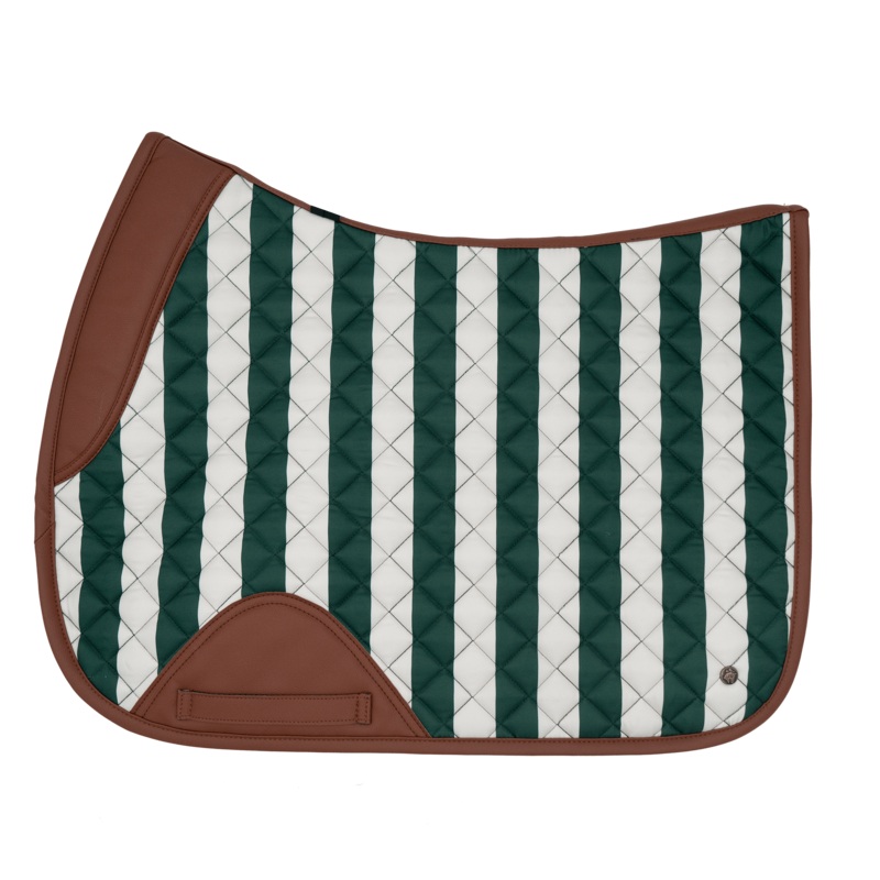 16C Jumper pad in Carmel Stripe, dark green & ivory, finished in cognac leatherette.Built for high performance featuring wither relief contour & padding, breathability, moisture-wicking lining and durable shape support. Designed to complement horse, rider