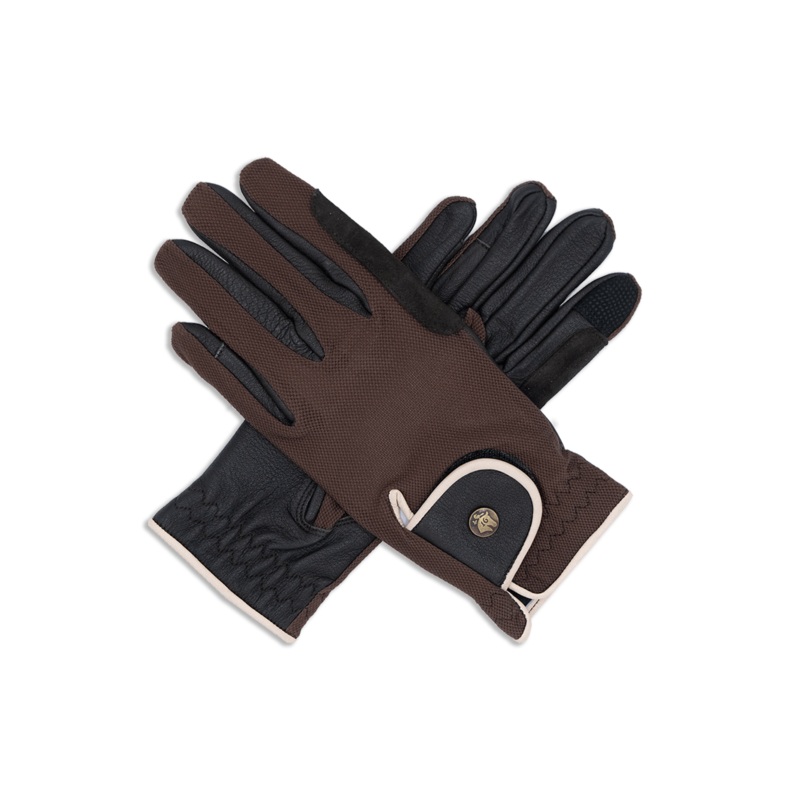 The palms are built from genuine goat leather, with reinforced suede grip patches at rein contact points. The outer layer of stretch mesh or jersey works with the natural movement of your hands, providing comfort and breathability. Secured with an easy velcro closure, finished with digital touch screen patches for your devices.