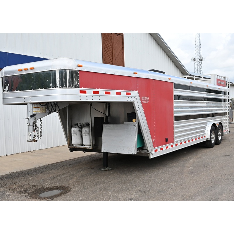 First Glance2013 year model EliteCombination steer, lamb, hog, goat show trailerAll aluminum construction8 wide x 24 long box 6 tallVIN #5MKWG2422D0013632Red aluminum skin top & polished aluminum slats on bottomRamp, hay rack, dressing room5 Removable pens