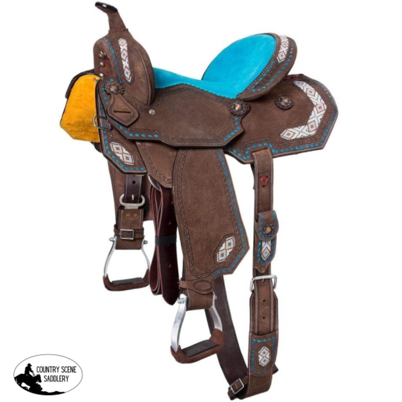 The perfect deep seated saddle for barrel racing or even heading down the trail. Dark roughout throughout for more grip and bright turquoise suede seat is nice and deep for added security. Accented with inlaid turquoise, coral, white and bronze beading, turquoise buckstitch edging and copper conchos. Easy to use Tough 1 Quick Change stirrup buckles, angled aluminum stirrups and complete back cinch with hoof pick pocket roundout this saddle.