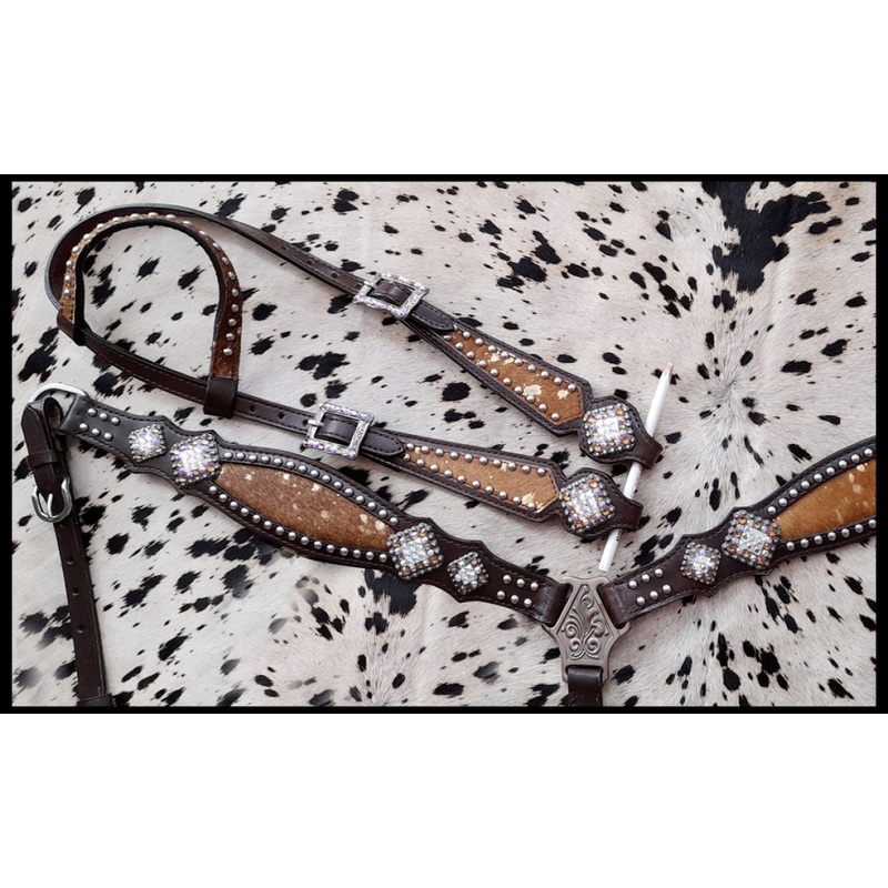 Cowhide inlay browband headstall and breast collar set with beads and bling conchos and silver hardware.This set features dark leather with a hair on cowhide inlay. Set is accented with a silver beading and bling Conchos. Headstall comes with 5/8" x 7' lea
