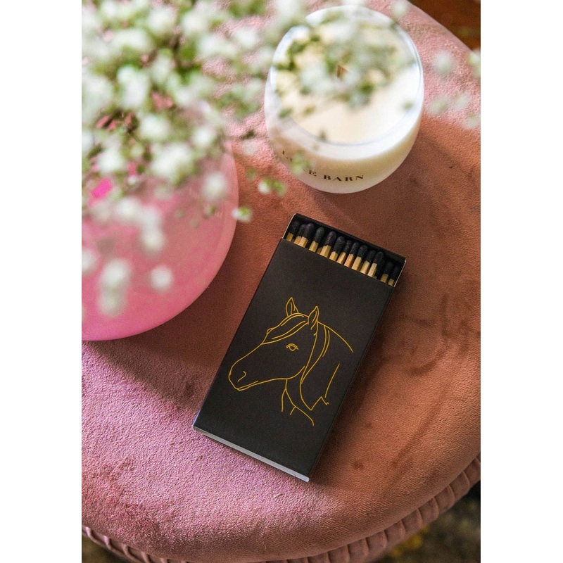 Meet the newest addition to the Stable Style home collection – Fira matches! This design was inspired by Fira, Raquel’s sweet Paint mare. Original abstract art is etched in gold foil to make the perfect box of matches. Light up your favorite Stable Style candles with pretty safety matches. Or leave them on the coffee table to display. They are the perfect addition to the Stable Style collection. Available in black with a gold horse head or white with a gold horse head. Each box contains approximately 50 matchesMatches are 4 inches in length – Close box before striking matches- Strike matches gently away from body- Store in dry placeMatches will only ship via ground services and may only be shipped within the United States and Canada.