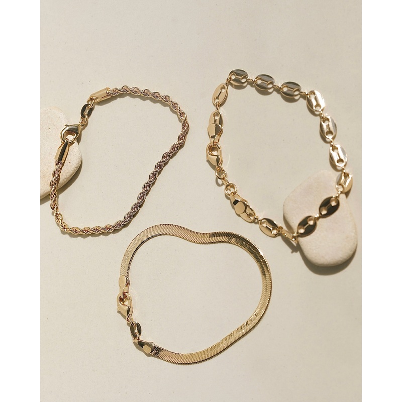 Material: Waterproof, tarnish proof, and hypoallergenic, crafted from brass with a durable 10k gold PVD coating.Set Includes: one 7" Snake Bracelet, one 7" Puff Link Bracelet, and one 7" Rope Bracelet