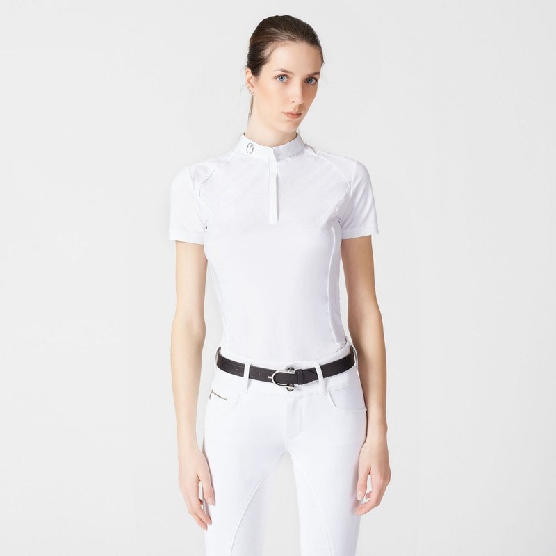 Introducing the Stoccarda Women’s Short Sleeve Competition Shirt by VESTRUM a versatile and functional choice for equestrian athletes. Crafted with technical fabrics, thisCompetition Shirtoffers easy-dry properties, eliminating the need for ironing while providing excellent moisture management. The fabric’s flexibility ensures a comfortable fit that moves with your body during performance. While Stoccarda does not feature a bib, it can still be utilized as a competition shirt in the total white version if desired. The stand-up collar adds a touch of sophistication when fully zipped up, and itsclean lines and stylish design make it an ideal companion under a competition jacket. Experience the perfect combination of style and functionality with the Stoccarda Women’s Short Sleeve Competition Shirt