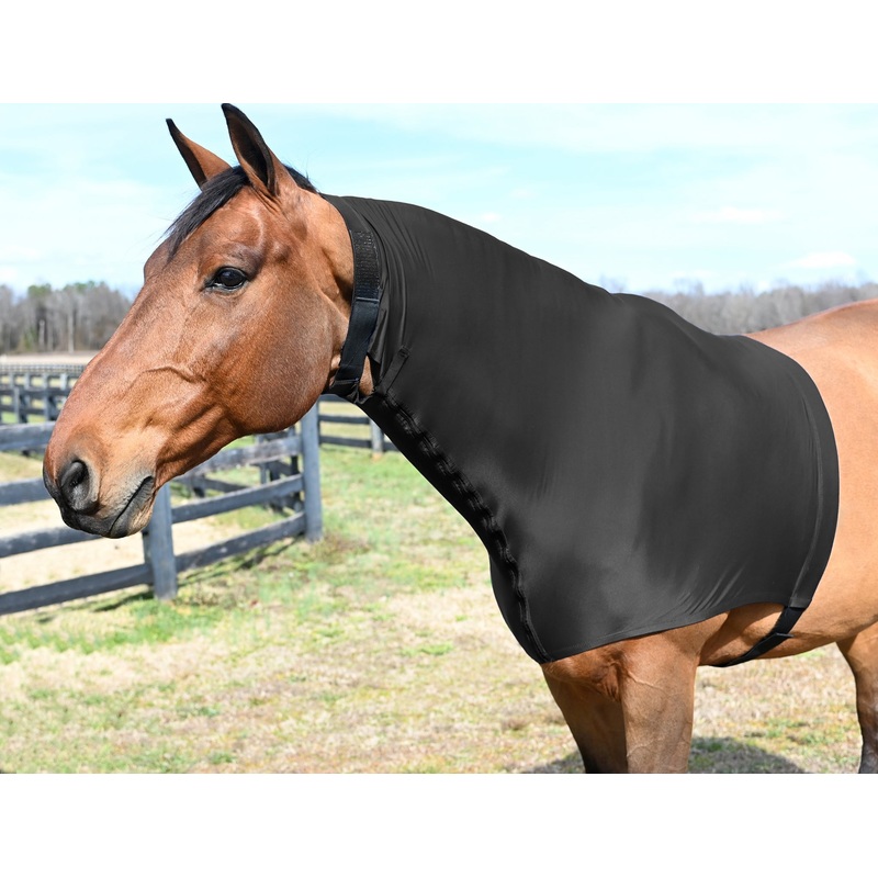 StretchX form-fitting, breathable StretchX Faceless hood with fully separating zipper features a no rub design for the ears, eyes and face. The fully separating zipper makes it super easy to take on and off the horse. It covers the neck, and shoulder which