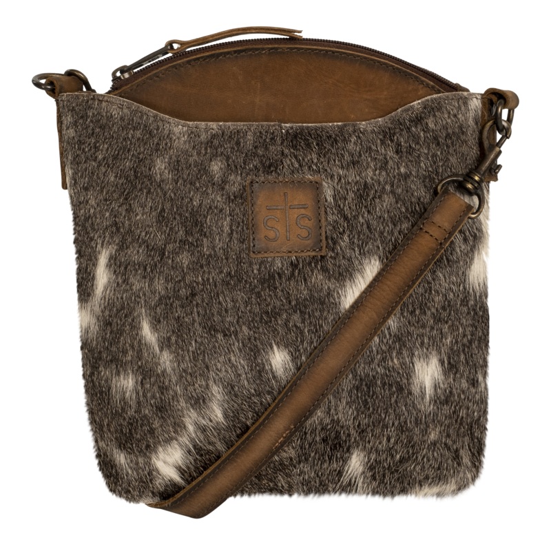 STS Ranchwear Cowhide Josie Crossbody PurseGenuine hair on hide cowhide with full grain leather trimZip closureRemovable & adjustable leather crossbody strap1 front exterior slip pocket with 1 interior scrunch pocket1 back exterior slip pocket with 1 inter