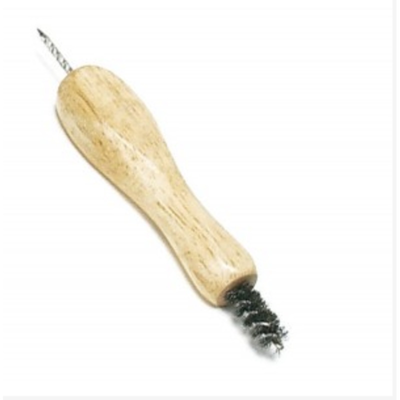 Wooden handle with wire brush on one end and pointed metal pick on the other. Perfect for cleaning out dirt-packed stud taps.