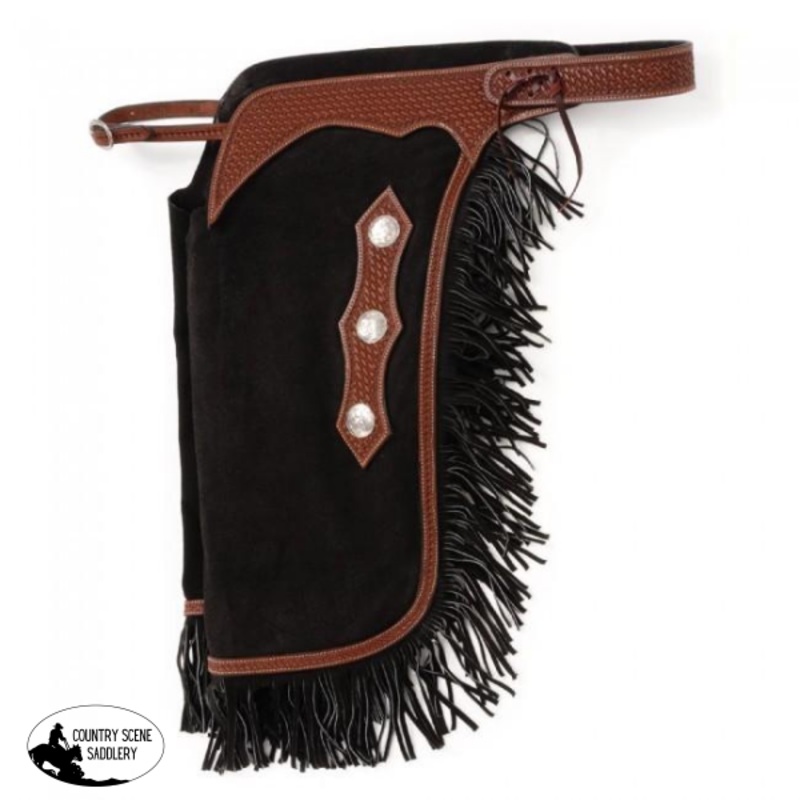 These suede chinks feature a basket tooled cowhide yoke and fringe down the length of each leg. Basketweave edging and basketweave design with 3 conchos adorn the side of each leg. Three buckle closure attachment on each thigh. Back of yoke is adjustable.(