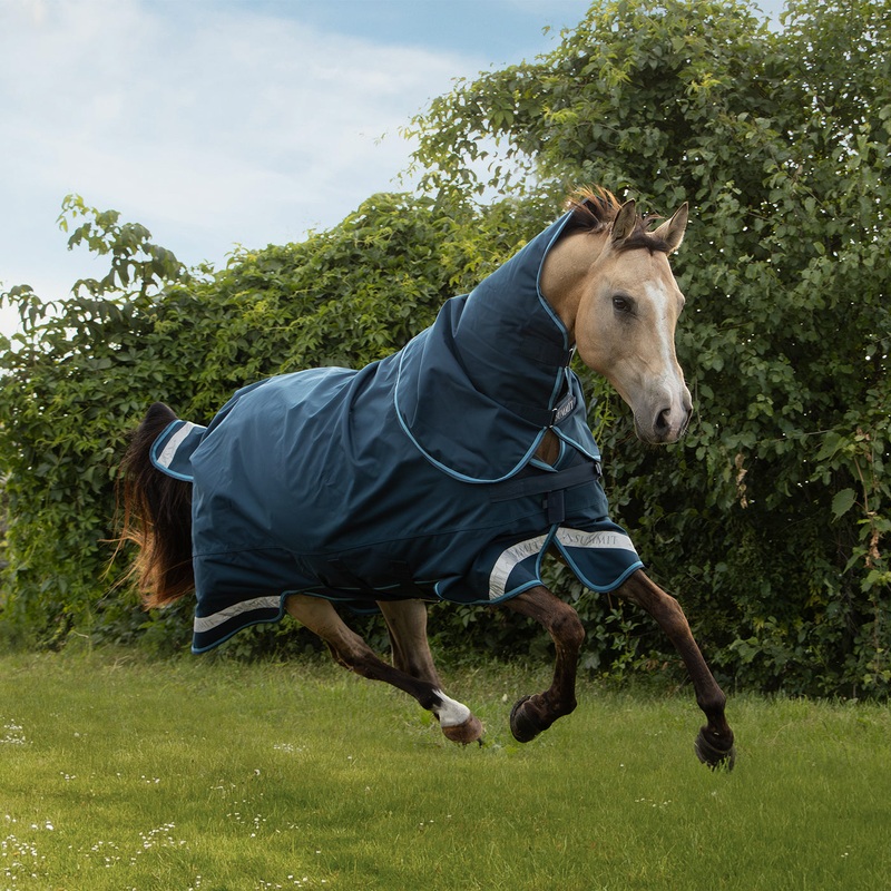 The Summit Nova Rainsheet offers protection to your horse during rainy weather. Made from 1050D Cordura ballistic nylon to withstand the elements. Features a 3 surcingle belly closure to keep blanket in place and internal wither padding to prevent rubs. Complete with a wipe-clean tail cord, and gun-metal hardware. Sold with matching hood for added coverage.