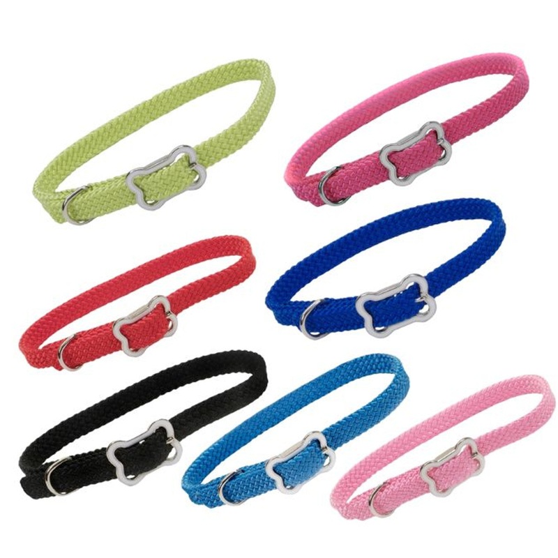 Great for growing puppies and small dogs. These fully adjustable collars are made from soft, braided nylon and boast a bone shaped buckle. Matching 6 leashes with chrome plated snaps complete the collection.Size: 3/8 x 12