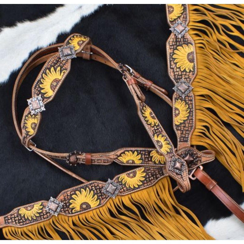 Hand Painted Sunflower Browband Headstall and Breastcollar Set with Fringe. This set features a medium colored leather with hand painted sunflowers throughout and a antiqued basketweave background. Breastcollar has mustard suede leather fringe and whole set is accented with copper conchos. Set comes complete with 5/8″ x 7′ split leather reins.