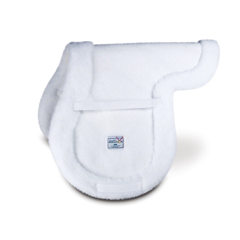Recognized as one of the finest fleece pads available, SuperQuilt pads look ready for the show ring even after hard use and lots of washing! Constructed with Medallion fleece on the top and a high quality quilted brushed cotton lining on the bottom, this pad features our popular olympic roll option: a two-layer roll of fleece around the saddle for a traditional appearance, a single layer of fleece under the seat and flaps for a close contact feel. Available in close contact, general purpose, and hunter to fit seat sizes 15″ to 19″. White only. Made in the USA.