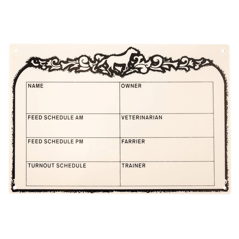 The Supra Stall Plate is the perfect solution to ensure horses receive individualized care. Call out important information about your horse with this plastic stall sign. Includes fields for your horse’s name, owner information, AM and PM feeding details, turnout schedule, veterinarian, trainer and farrier information. This reusable stall sign is compatible with dry erase markers and easily wipes clean when information changes. Includes predrilled holes for easy installation. Mounting hardware not included.