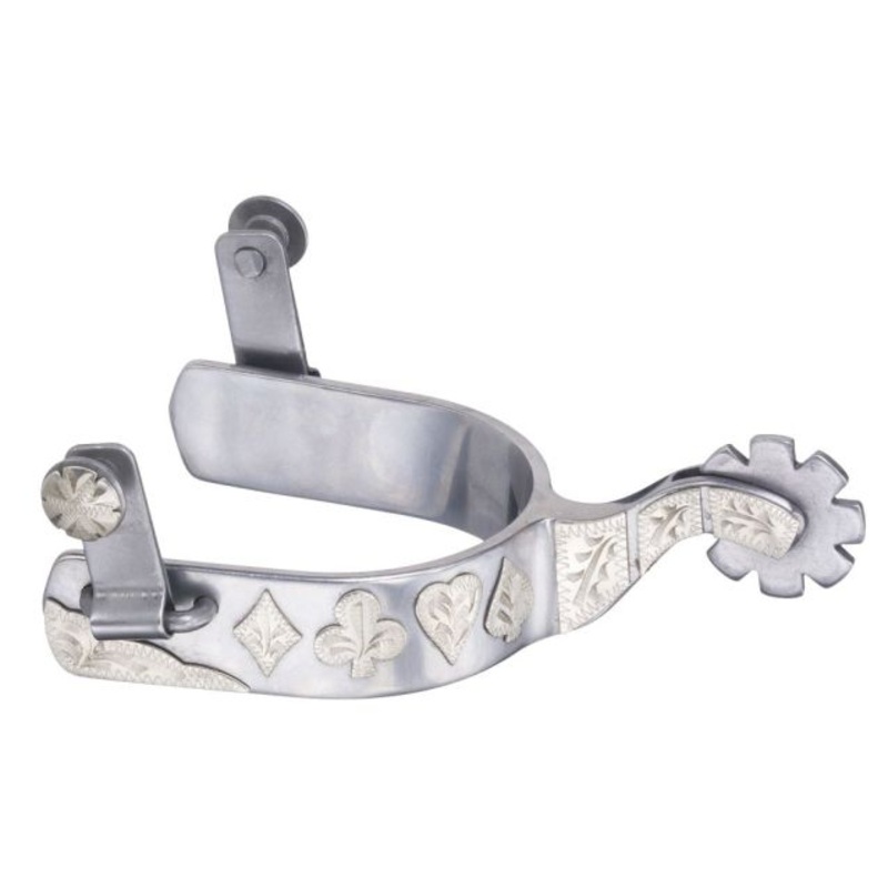 No one will call your bluff with these stylish poker themed spurs! Band features silver overlay card suits: diamond, club, heart, and spade. Other silver engraved overlays adorn the button and shank for just the right amount of shine. Complete with 8-point blunt rowel. Sold as a pair.