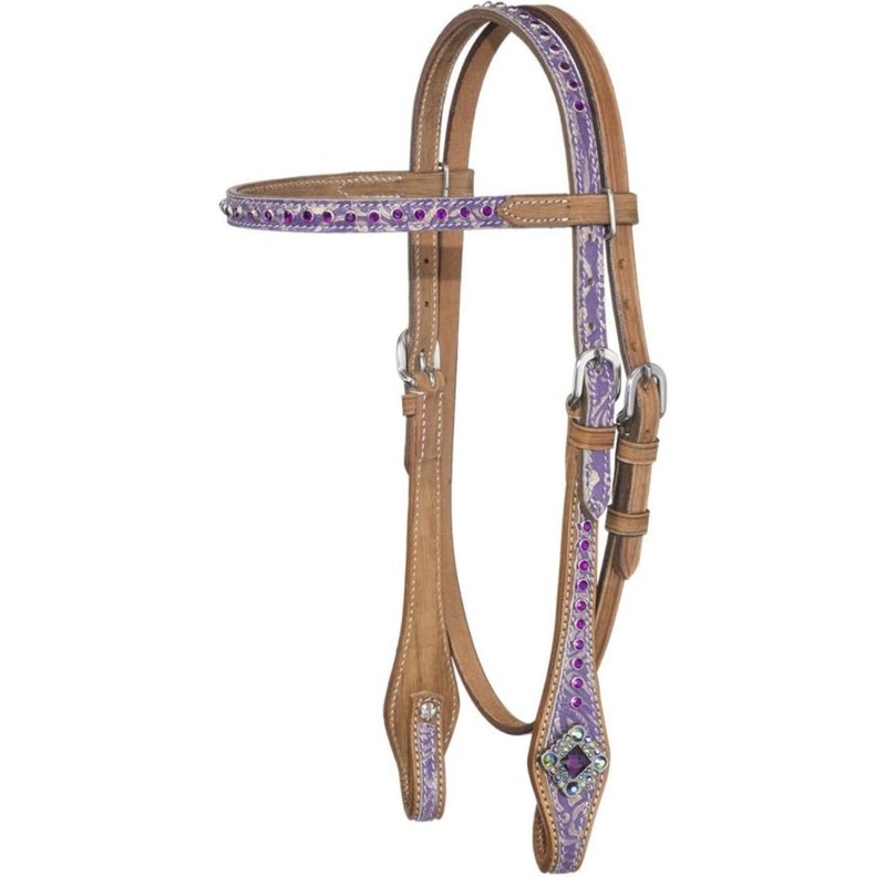 Miniature Sweet Pea headstall features purple and gold floral overlay with Swarovski crystals and purple gem accents. Fit for pony or mini.
