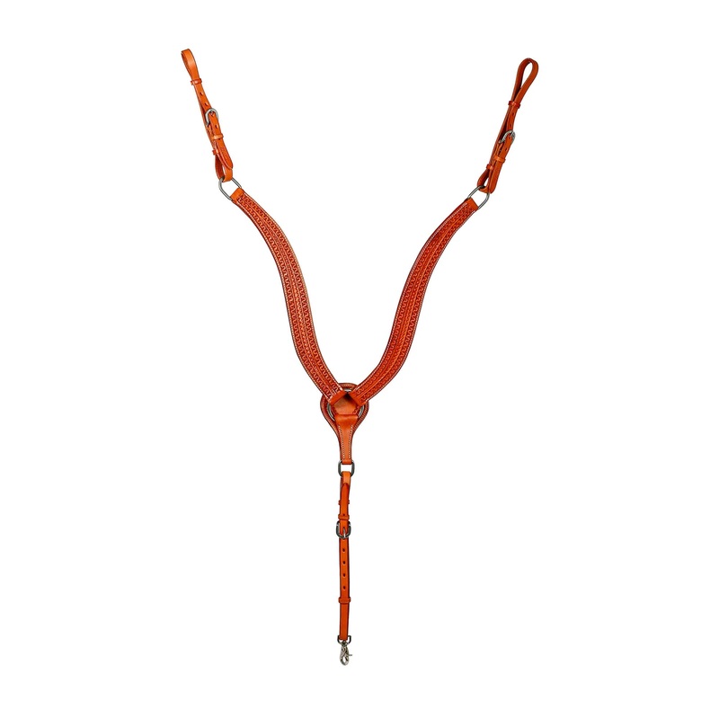 A tapered ‘Y’ shaped breast collar with detailed tooling, white stitching and uncomplicated hardware.