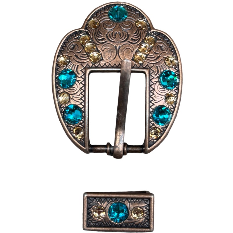 Copper fancy buckle with Teal/Champagne European crystalsBuckle measures 1 3/4" x 2 1/4" and can fit 5/8" to 3/4"Perfect for dog collars, spur straps, headstalls. etc.Lifetime guarantee on all crystals.