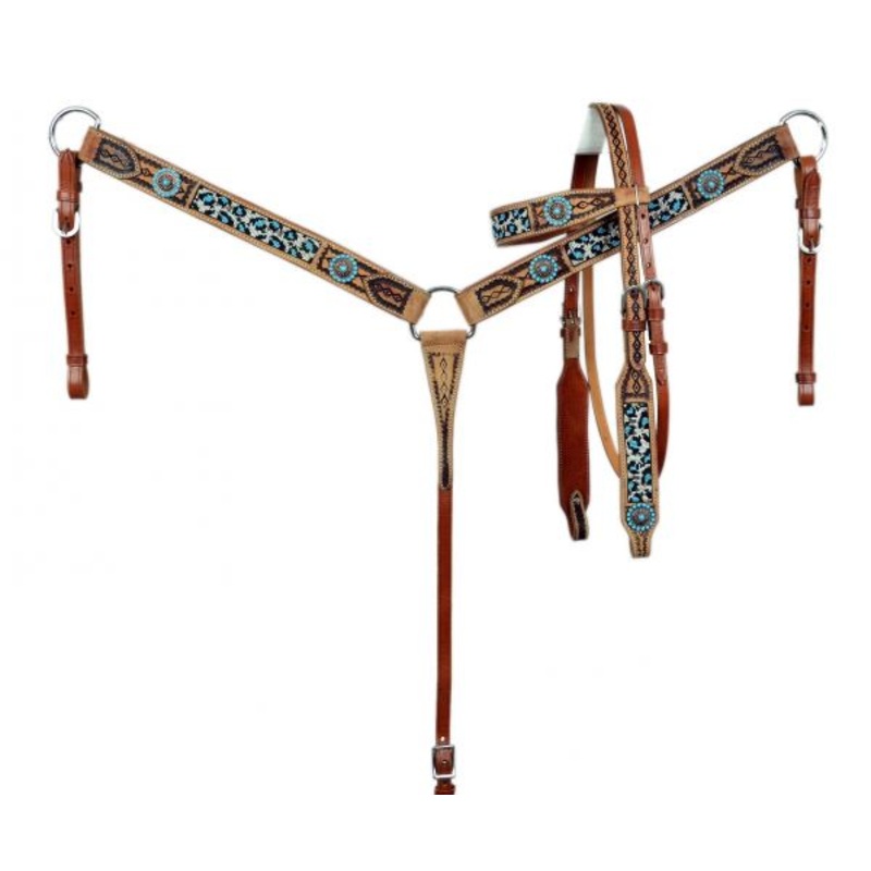 Browband beaded teal Cheetah Headstall and Breast collar Set with teal conchos, and a two tone light rough out and medium oil leather. This set features a two-tone light rough out and medium colored leather with cheetah print beaded inlay and teal conchos. Set comes complete with 5/8″ x 7′ split leather reins.