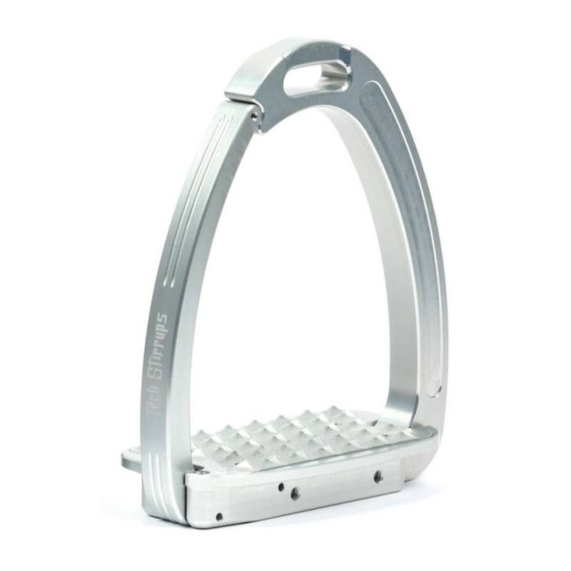 One end of the moving part is fixed to the tread, while the other end is secured to the stirrup by spring pressure and a magnetic locking system.These patented Tech Stirrups are 100% made in Italy.