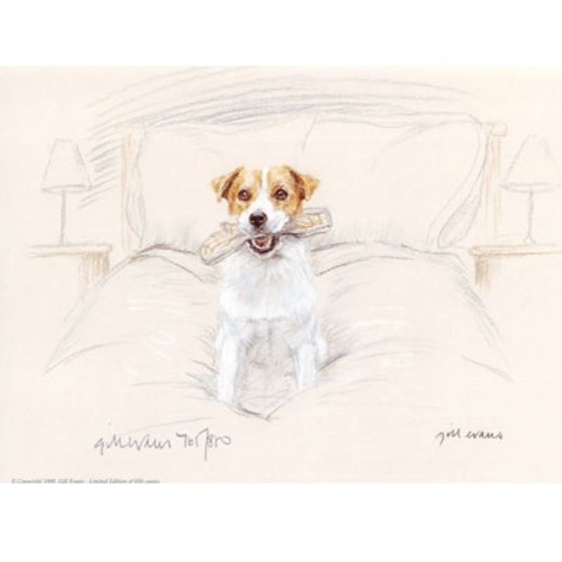 Terrier with Slipper By: Gill Evans 12 3/4 x 10 3/4 Matted size. Shrink WrappedSize:12.75 x 10.75