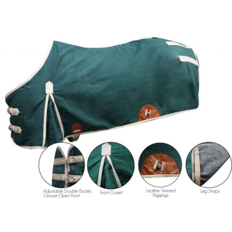 The 16oz Water Resistant TreatedCanvasDouble TBlanket. Heavy Wool Blend Lining. The fitted, Contoured Shape and Shoulder Gussets Allow the Horse to Move Naturally Whilte STaying In Place. Open Front Adjustable Double Buckle Closures. The Blanket Secures with a Single Leather Trimmed Adjustable Surcingle Underneath The Girth Line and Two Adjustable Leather Trimmed Leg Straps for Added Security.