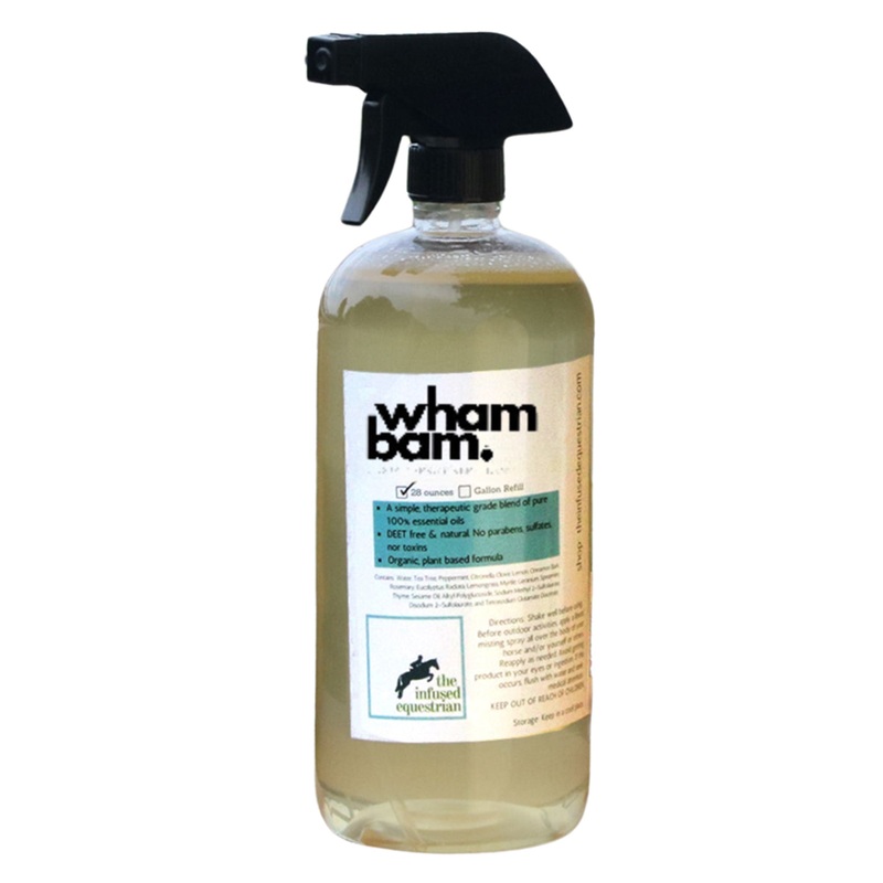 Wham Bam is a proprietary blend proven to keep bugs and insects off you and your horse. Wham Bam is a great alternative to toxic sprays, as it is DEET free and all-natural. The plant based, organic formula is made from a therapeutic grade blend of 100% pur