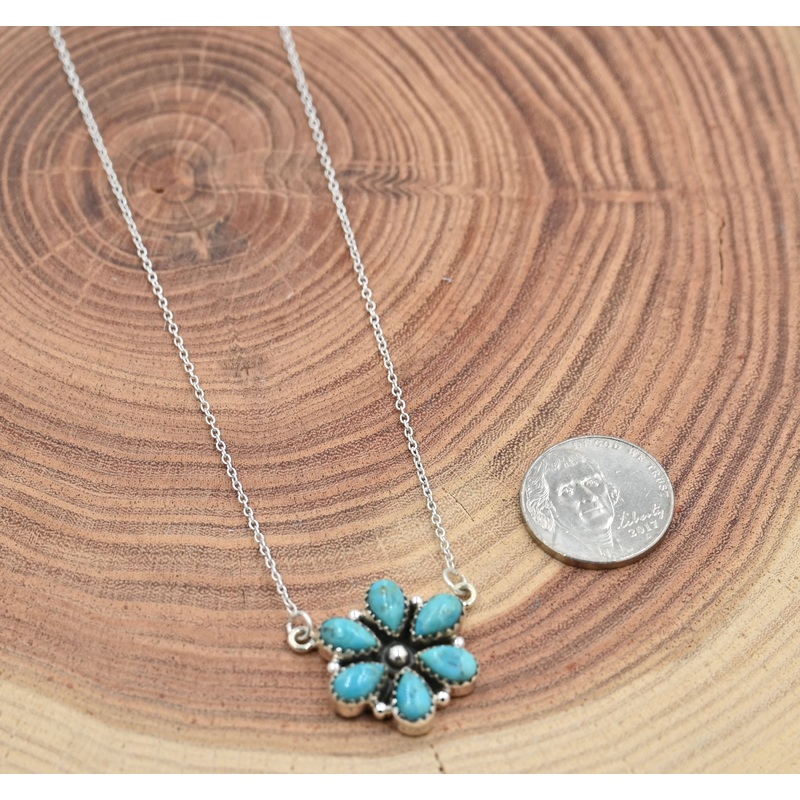 The Mia NecklaceKingman Turquoise stoneSterling silverFlower Pendant NecklaceHada CollectionSecure clasp for comfortable wearThe flower pendant style makes it versatile for everyday wear, yet its refined beauty also shines during special occasions, offerin