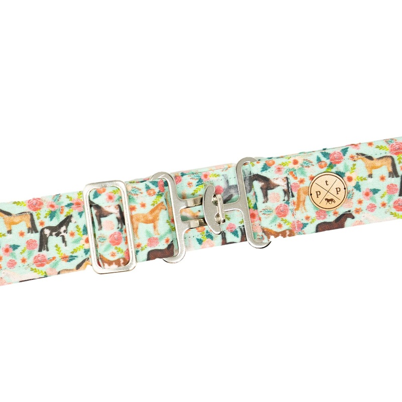 A fashion-forward fabric belt that you can take from the barn to the show ring to even a night out! Made with cotton fabric and cotton webbing, these belts also feature metal buckles and slides.