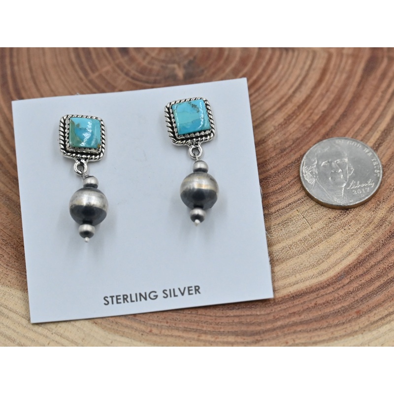 The Saylor Stud Earrings with Turquoise Stones and Dangle PearlsTurquoise stone studs with elegant dangle pearlAuthentic Navajo PearlsKingman Turquoise StudsStamped Sterling SilverStamped Hada CollectionSecure post-back for a comfortable fitFeaturing vibra