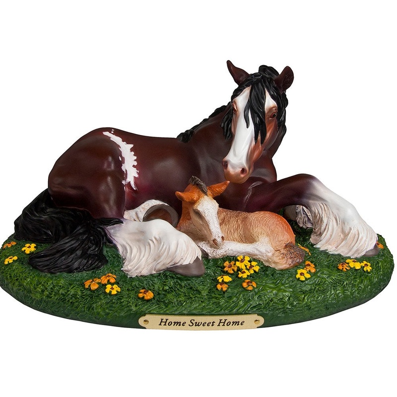 The Clydesdale is a popular breed that originated in mid-18th Century Scotland, and was historically used to haul carts and carriages. It is known as a gentle giant for its large size and easygoing temperament. With the Trail Of Painted Ponies Home Sweet Home, the artist has captured its loving and nurturing side by placing a newborn foal cuddled in the protective care of its proud mother. For Clydesdale babies, mom is home.
