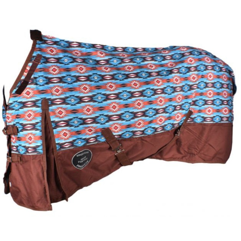 The Waterproof and Breathable Showman Orange and Turquoise Southwest Print 1200 Denier Perfect Fit Turnout Blanket.