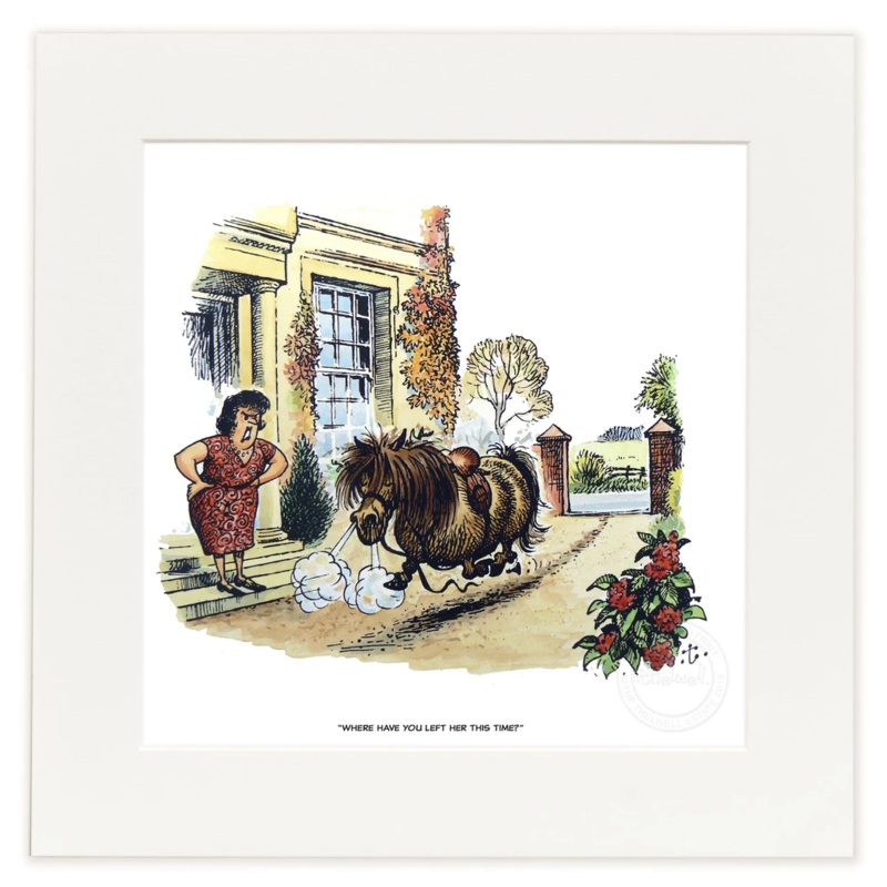 Open edition, embossed fun Thelwell cartoon print for framing.Mounted in a 40cm square antique white mount ready to frame.Printed on high quality, UV resistant Conqueror paper.Newly coloured up by David Thelwell.These prints are collectable and reproduced by permission of the Thelwell Estate.Perfect gift for horse riders young and old.