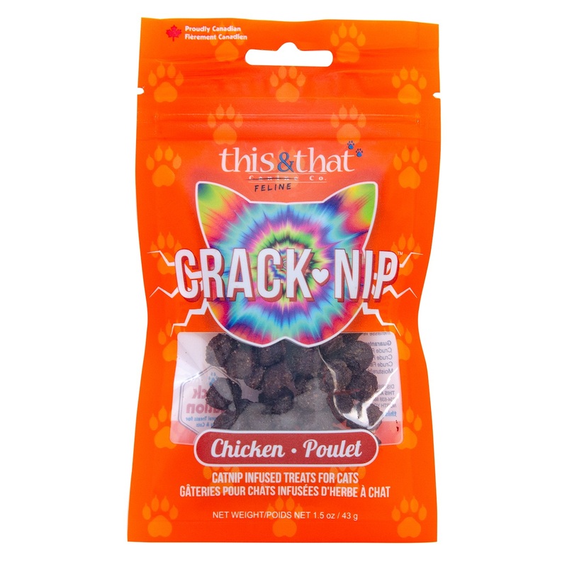 This & That Crack Nip Chicken offers a protein rich, and moist snack that your cat will love. Cat nip infused with a chicken taste.Cat nip infusedChicken flavour43 g