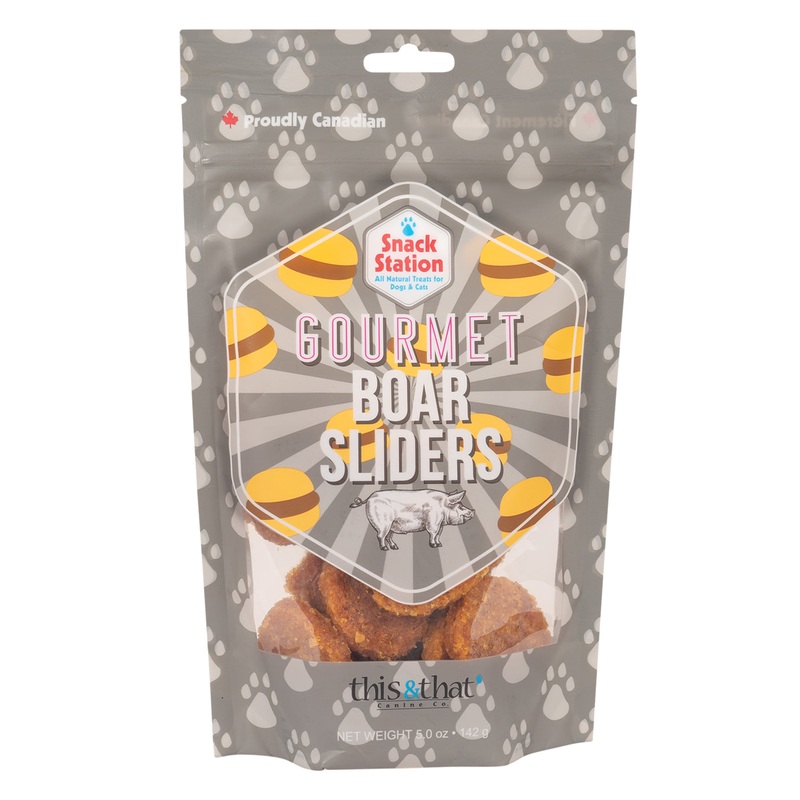This & That Gourmet Boar Sliders offer big flavour and low fat! These soft treats are great for training and are ideal for pets with allergies to common proteins. Great for dogs and cats!Soft dog treatsLow fatGreat for allergiesGreat for dogs and cats142 g