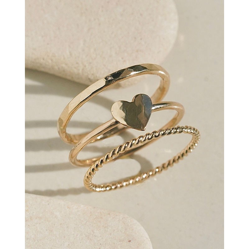 Set includes: one Tiny Heart Stacking Ring,one Thick Stacking Ring, and one Twist Wire Ring