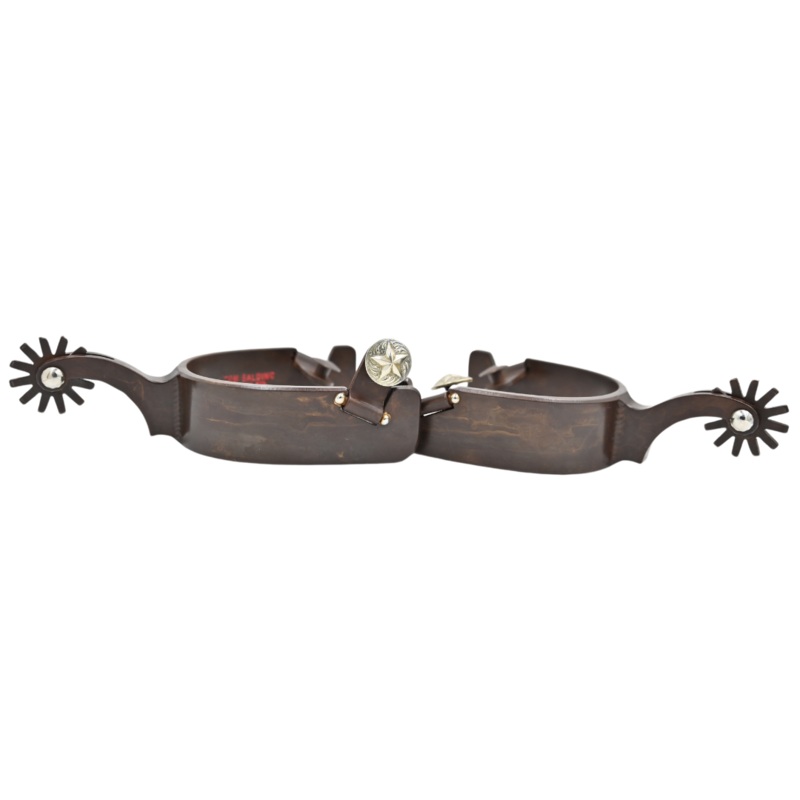 These spurs feature stylish Texas Star buttons and a classic brown finish, giving them an elegant appearance. Inspired by the Billy Klapper style, they are designed with increased weight for added stability. Each spur is individually handcrafted by skilled craftsmen, ensuring a comfortable fit and the ability to stay securely on your boots. They allow free movement while maintaining stability and are crafted from high-quality materials for durability and performance.