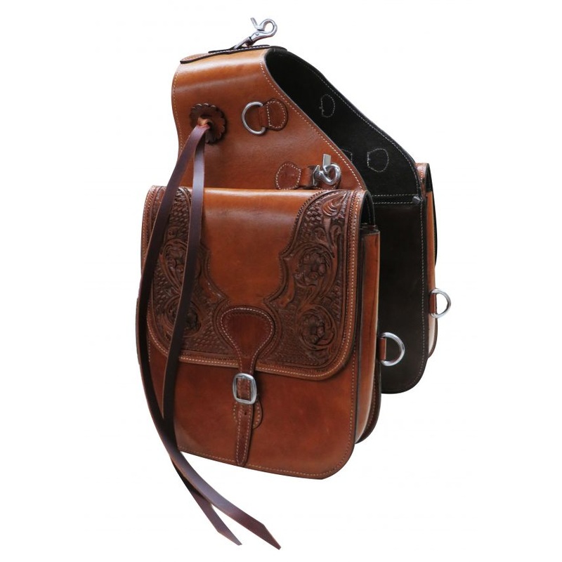SFSB61Showman Tooled leather saddle bag with snaps. This saddle bag features floral tooled leather with leather strings. Comes equipped with front D rings and 3 scissor snap clips.Bags measures 10" x 10" x 3".