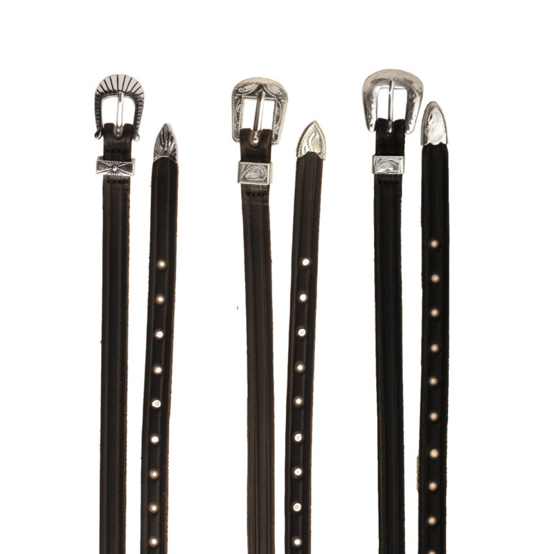 3/8 Wide x 18 Long English Bridle Leather Strap with a Silver Plate Buckle Set.THE TIPS ARE ABLE TO BE REMOVED TO FIT THROUGH THE SPUR SLOTSENGRAVED CENTER BAR BUCKLE.THIS STRAP DOES NOT HAVE A TIP.