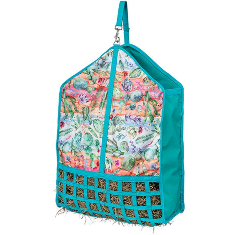 Tough 1 Webbed Cactus Print Hay Bag2" x 2" slow feed style openingsDurable nylon webbingBottom webbing allows dust to fall outAdjustable strap with clip22" x 9" x 32"Top LoadThis hay bag is designed with webbed sides to promote airflow and keep hay fresh w