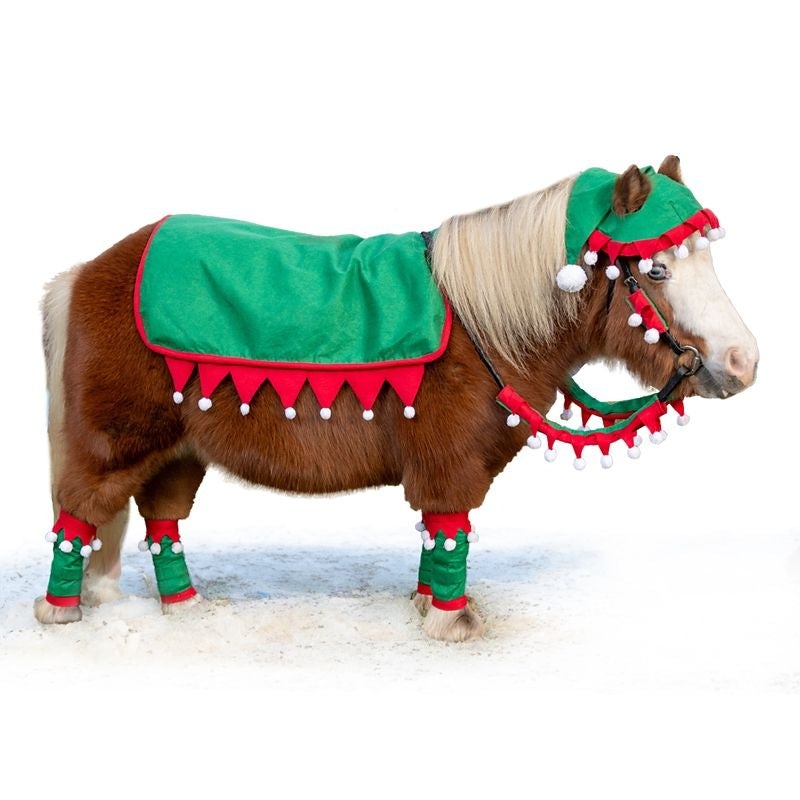 Celebrate the holidays with your mini horse! This red and green felt horsewear set is perfect for parades or festive photoshoots! Each piece is easy to attach with strong Quick Grip closures. Set includes 1 western saddle pad cover, 4 leg wraps, 2 rein covers, mini horse elf hat, and a 3-piece halter cover set. Fits most average horses.