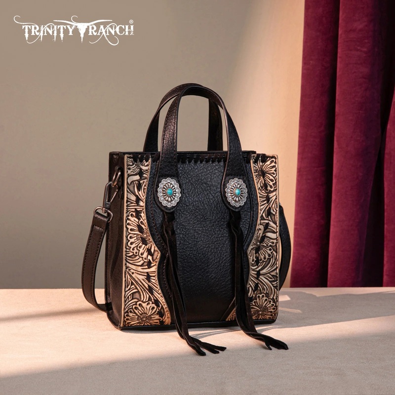 Trinity Ranch line by Montana West, this mini tote/crossbody has:Floral tooled patternWhipstitch detailsAccent with antique silver turquoise stone conchoLeather tassel on the frontTop zipper closureInside of the bag includes a zippered pocket and an open p