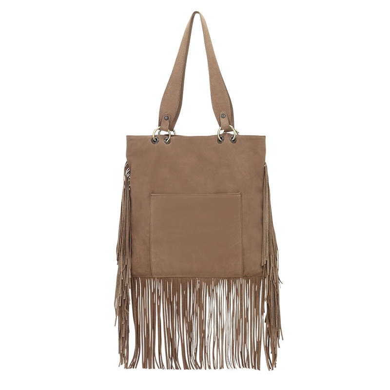 Fringe tote with large front slip pocket. Body is made of super soft fawn-colored nubuck 100% Genuine cow leather and accented with fringe. Magnetic snap closure. Double shoulder straps are 26" in length with 12" drop. Interior is lined with cotton denim a