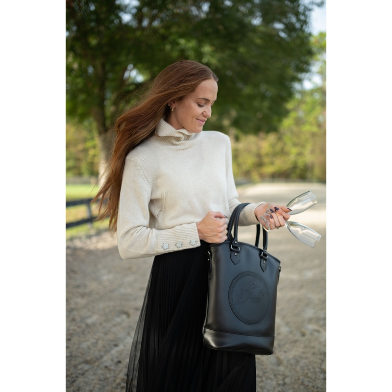Introducing the Aprs-Show Cooler…the fun and functional tote for keeping your drinks and assorted items cold. Holds 2 bottles in a removable bottle insert, includes an optional shoulder strap and exterior pocket. Synthetic leather base, leather accents.