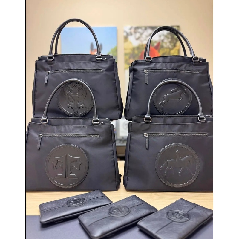 Computer pocket, separate interior sections for folders, notebooks chargers, water bottle, keys etc. Side sleeve lets you slip it over the handles of your rolling bag. Shorter handles or over the shoulder strap included. Tough water resistant premium fabric with your choice of Jumper, Dressage, Fox or TT embossed leather.