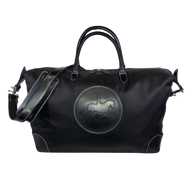Our goal from the launch of the Tucker Tweed Equestrian brand 6 years ago was to ultimately travel in Equestrian style. We could not be happier to debut the newest piece of our collection. This generous overnight duffle bag is designed with padded heavy/duty 900d black nylon featuring full grain smooth leather accents in tones of chestnut or black. Comfort continues with supple rolled leather handles and an optional, adjustable padded shoulder strap. Refined interior with private zip and open pocket. Finished with silver feet and hardware.Color options: Black/Chestnut, Black/BlackEmbossing Options: Hunter/Jumper, Dressage, Foxhunting or Signature logoFeatures:Padded black 900d nylonLeather trim, corners, handles and accentsCopper printed nylon interiorInterior zipper and open pocketsRolled leather handles with 8dropOptional, adjustable padded shoulder strap with drop up to 30Dimensions: 24 x 8 x 12Weight: 2.0 lbs